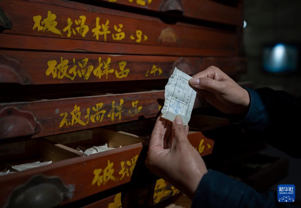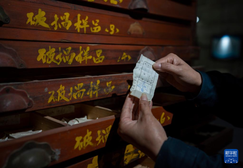 是5月16日拍攝的中國光學歷史博物館內收藏的一臺玻璃長刻度機。  5月16日,工作人員在展示玻璃樣品柜內的一個玻璃樣品。