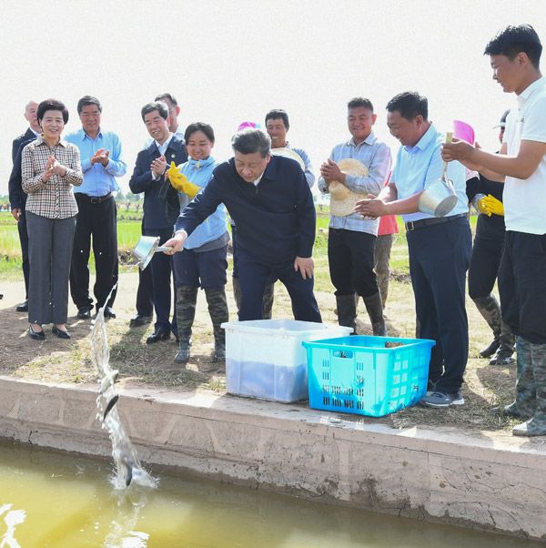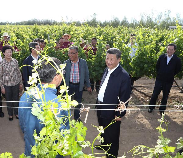 習近平總書記9日在銀川考察調研。他先后來到賀蘭縣稻漁空間鄉村生態觀光園、賀蘭山東麓葡萄種植園,了解當地發展特色農業產業、加強賀蘭山生態保護等情況。